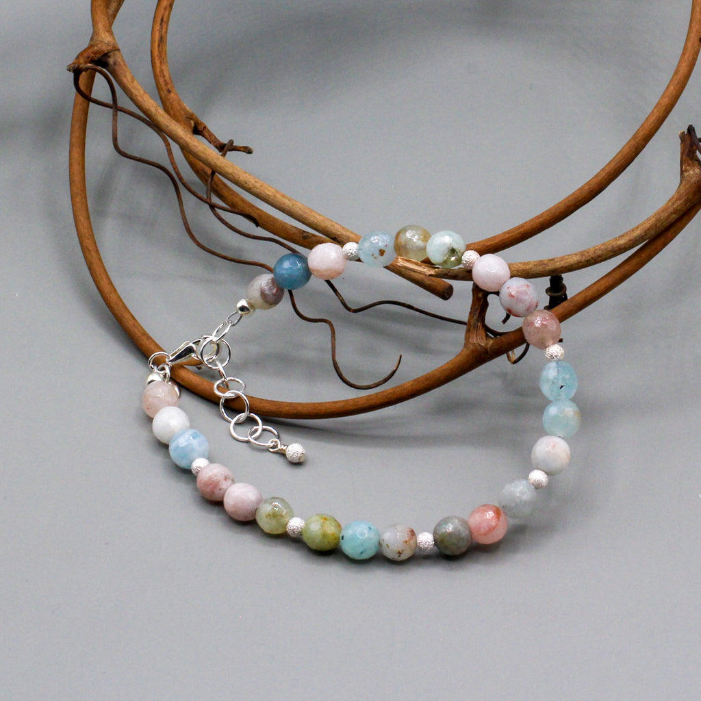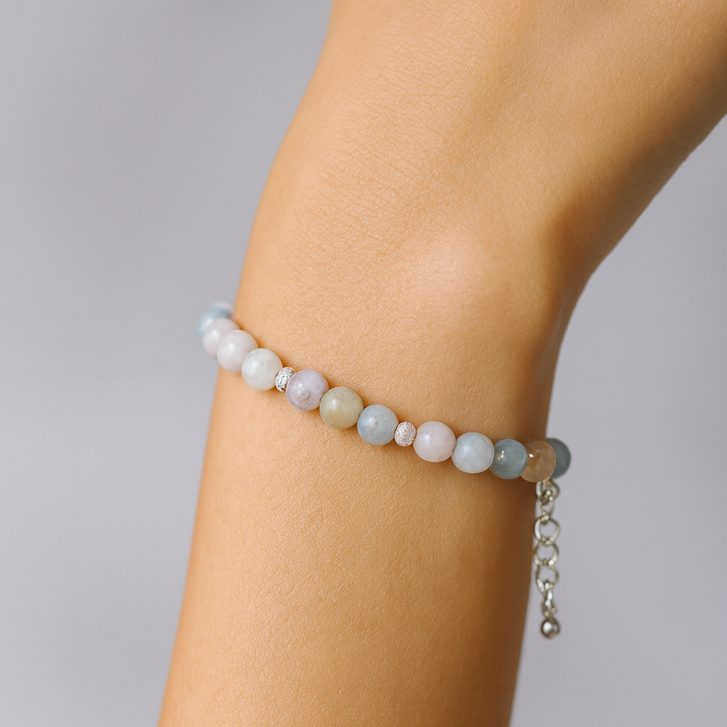 Elevate your accessory game with our Blush Bracelet. Handmade with a Sterling Silver extender chain, Lobster Clasp and Beryl Gemstone beads, it offers an adjustable fit and a charming touch. The pastel gemstones and stardust beads add a subtle sparkle to any outfit, making it the perfect addition to your jewelry collection.