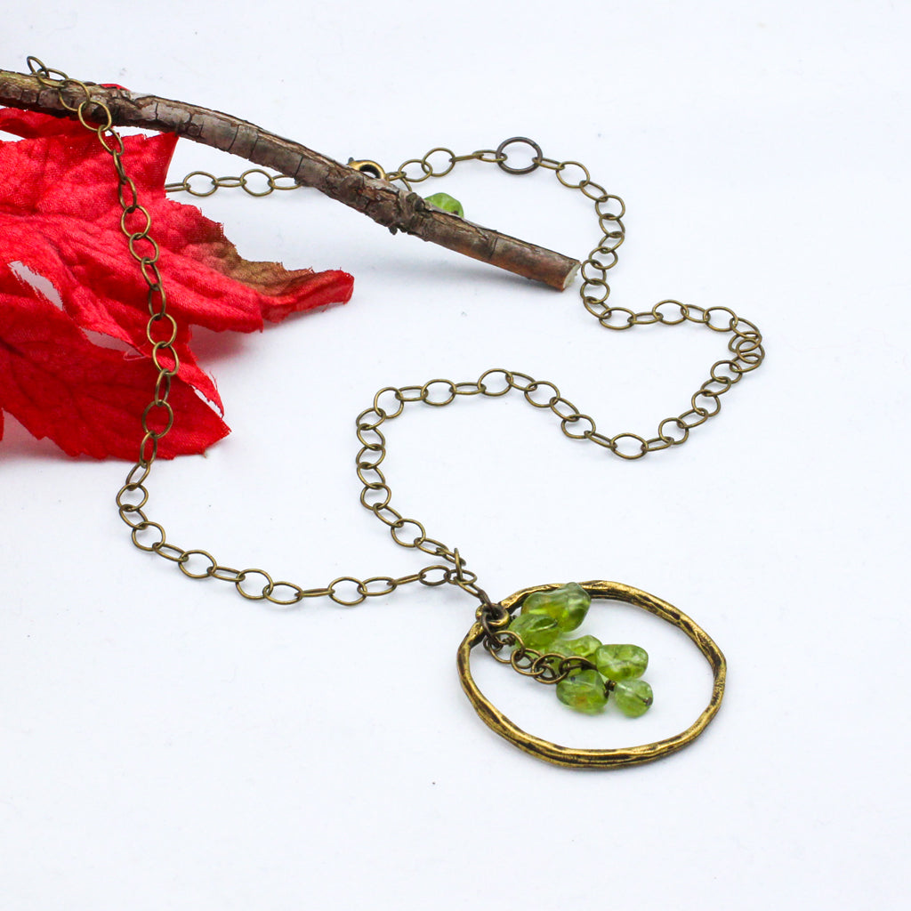 This stunning handmade necklace features a large loop focal with vibrant peridot gemstones cascading down the center, creating a unique and eye-catching design. The antique bronze metals add an earthy and vintage touch to the piece, while the peridot gemstones add a pop of color and sparkle. It is finished with a lobster claw clasp.