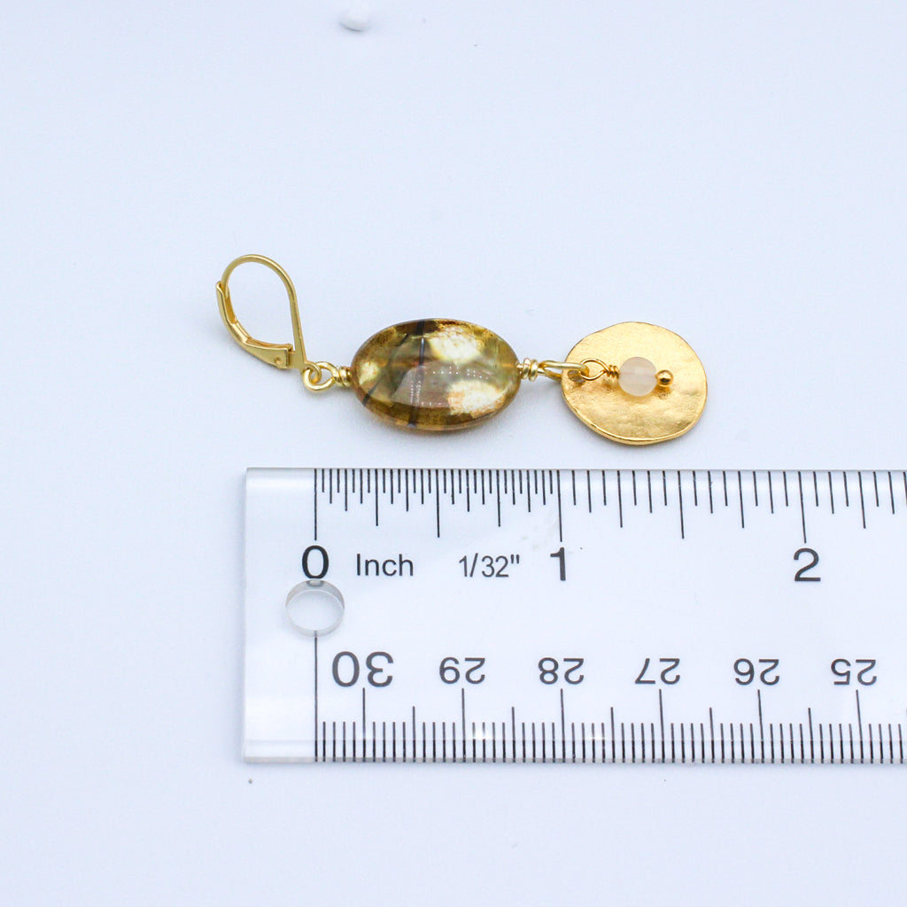 Expertly handcrafted 24K gold electroplated brass earrings featuring beautiful moonstone and Botswana agate gemstones. Measuring at 1 1/2 inches with a lever-back ear-wire for easy wearing and a touch of glamour. Add a touch of elegance to any outfit with these unique and timeless earrings.